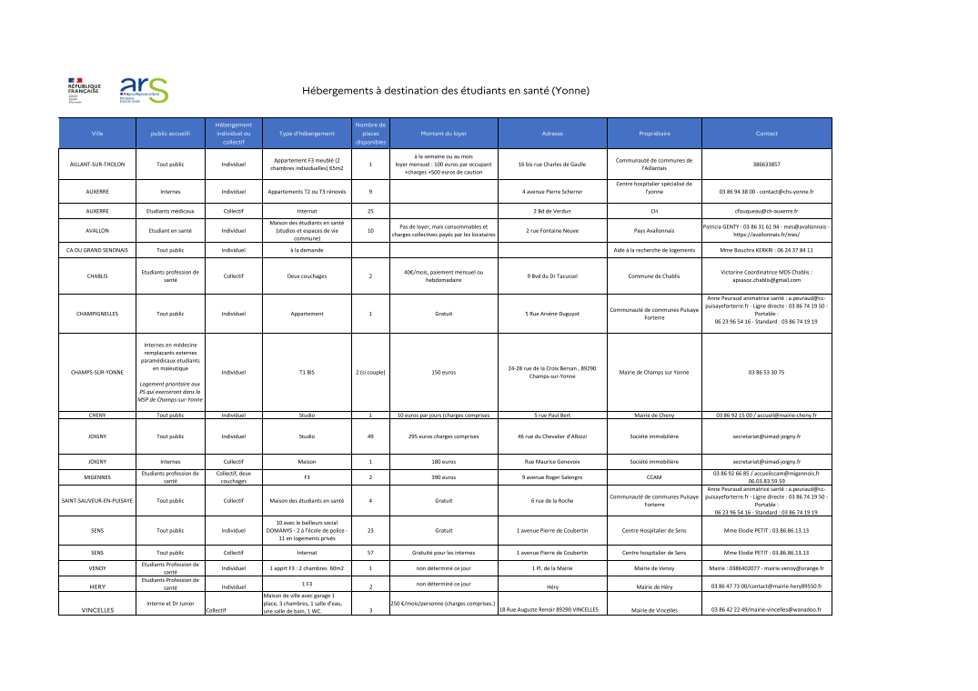 HÉBERGEMENTS POSSIBLES POUR LES ÉTUDIANTS EN SANTÉ